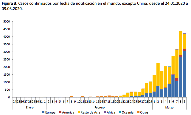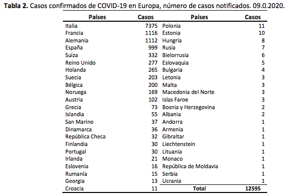 A nivel europeo, el país que más preocupa es Italia, con más de 7.000 casos pese a la dureza de las medidas impuestas desde que comenzó el brote en el norte. La presión que está suponiendo la situación para el sistema sanitario ha llevado al Gobierno italiano a decretar la restricción de los viajes en todo el país al tiempo que se han suspendido las clases en todo el territorio e impuesto otras medidas como el cierre de museos o teatros, discotecas y la imposición de más de un metro de separación de las mesas de los restaurantes, entre otras.