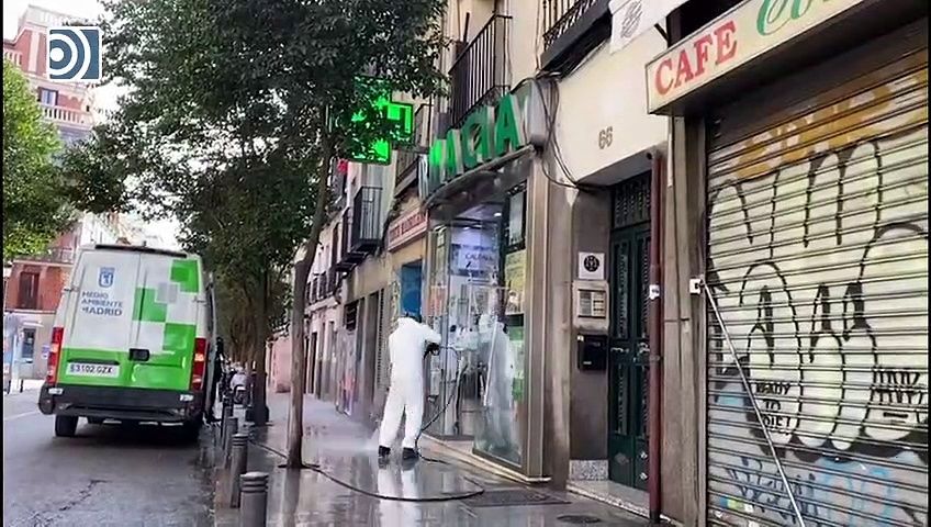 El Ayuntamiento de Madrid ha reforzado al máximo el servicio de limpieza con agua (baldeos y pistolas de alta presión) en las calles e incorpora por primera vez con carácter general desinfectante hipoclorito sódico, compuesto que tiene efecto viricida, según un comunicado del Gobierno municipal, que encabeza José Luis Martínez-Almeida.