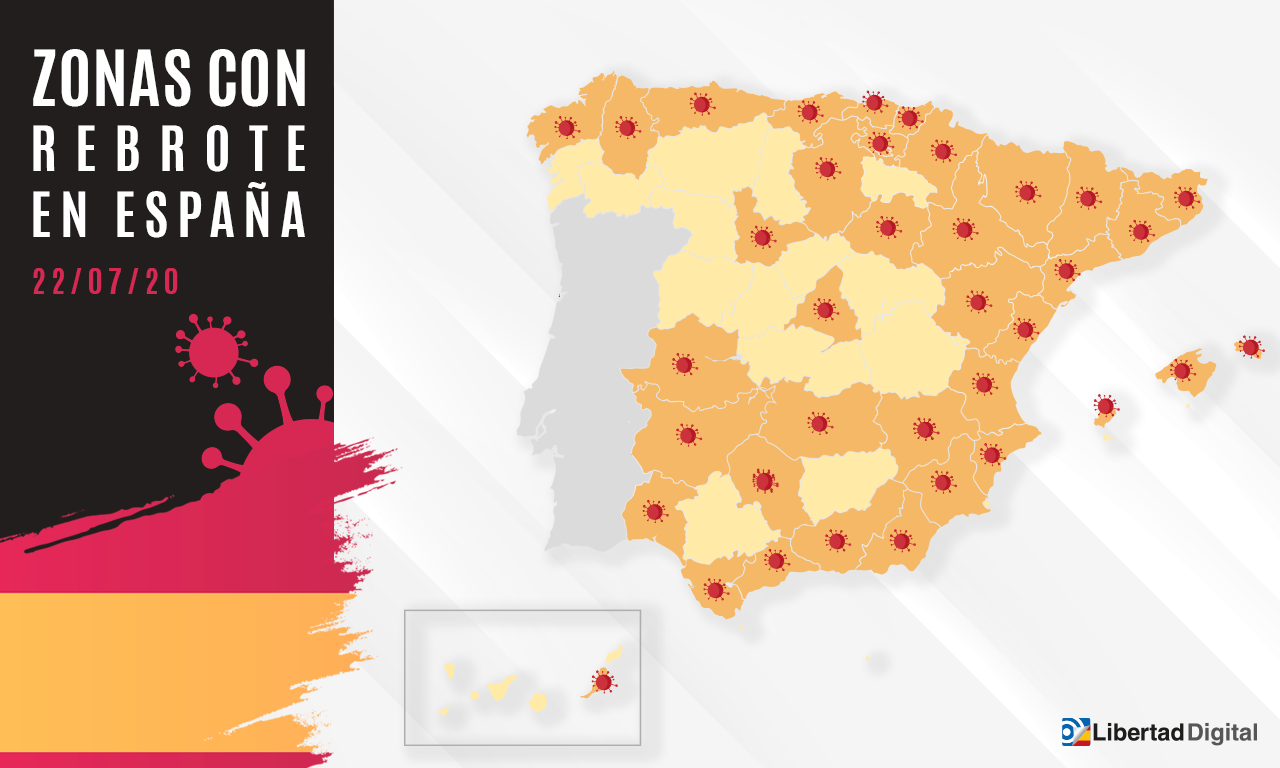 A las 18:30 horas de este miércoles, 22 de julio, la radiografía de rebrotes en España, recogida por Europa Press, es la siguiente: