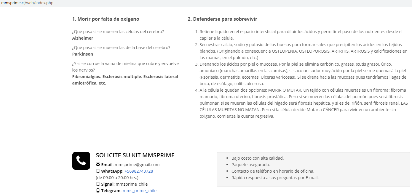 No les sorprenderá que entre las organizaciones asociadas encontremos una llamada MMS Prime. Seguro que recuerdan la solución mineral milagrosa de la que hablábamos tan sólo unas líneas más arriba, sobre la que pesan multitud de casos de intoxicación y que desató una cadena de alertas sanitarias a nivel internacional. Pues bien, la siguen vendiendo sin pudor.
