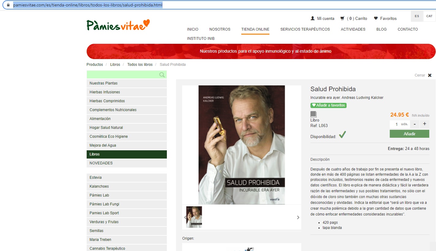 Tampoco es difícil encontrar al máximo referente de la "solución milagrosa" a nivel mundial en su web, que -por cierto- vende productos que "abren caminos hacia la autogestión de la salud y la autonomía personal". En ella, podemos adquirir el libro ‘Salud prohibida’, de Andreas Kalcker.
