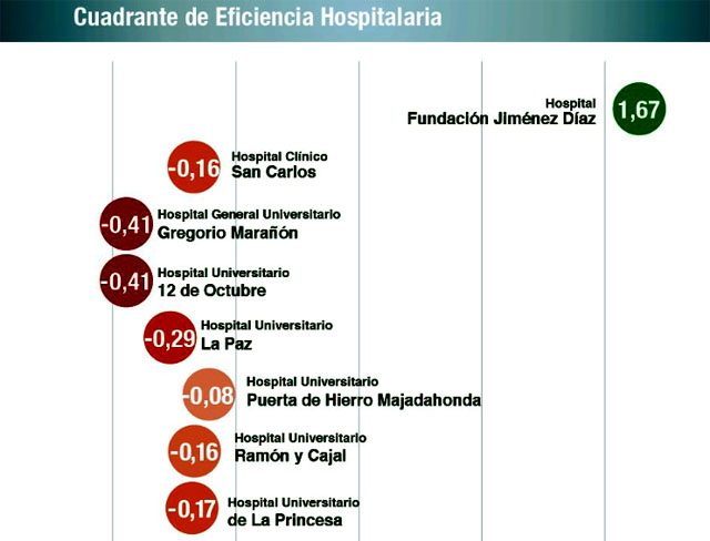 El resto de hospitales incluidos en el análisis presentan eficiencia negativa, en términos relativos en referencia al valor medio del conjunto de hospitales analizados, muy marcado por los buenos resultados de la Fundación Jiménez Díaz, ocupando la segunda posición en el Cuadrante el Hospital Puerta de Hierro (-0,08), mientras que el Clínico San Carlos y el Ramón y Cajal ocupan la tercera posición (-0,16), siendo los hospitales 12 de Octubre y Gregorio Marañón los que presentan los ratios más bajos (-0,41).