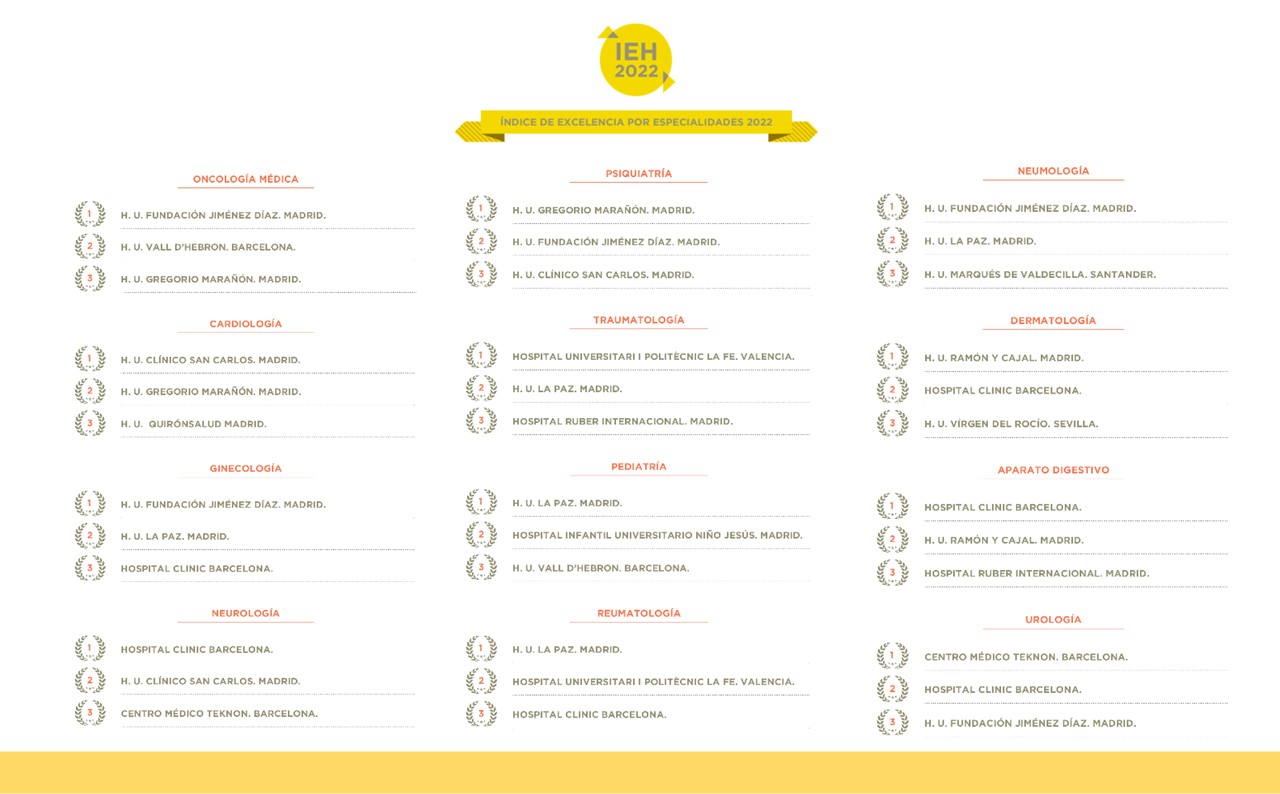 El resto de los centros lo hacen con una especialidad, con el Hospital Clínico San Carlos liderando Cardiología, el Hospital Universitario Ramón y Cajal la especialidad de Dermatología; el Hospital Universitario Gregorio Marañón con Psiquiatría, el Centro Médico Teknon en Urología, y el Hospital Universitari i Politecnic La Fe de València la Traumatología.