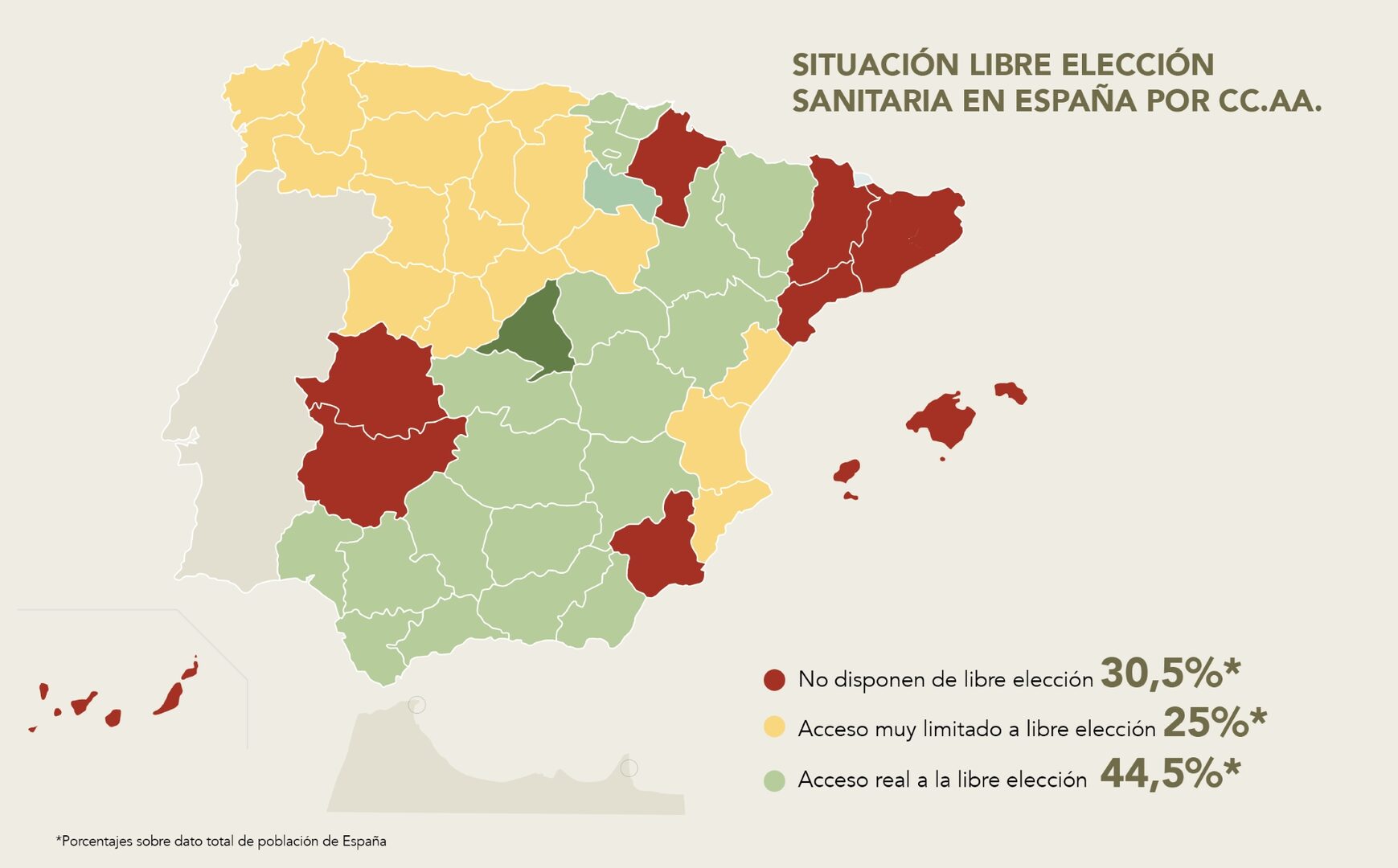 La sanidad es una competencia descentralizada y, a pesar de que existen una serie de pautas generales establecidas desde el Gobierno central, cada comunidad autónoma tiene capacidad para gestionar y organizar su propio sistema de salud, lo que implica tomar decisiones sobre la planificación, la financiación y la provisión de servicios sanitarios en su territorio. "De los más de 47 millones de habitantes que tiene España, tan solo poco más de un 44% cuenta con un acceso real a la libre elección, lo que evidencia que aún hay que dar varios pasos al frente para que se termine de implantar con éxito en el conjunto de la geografía española. Apenas se han producido avances en el último lustro", señala el Instituto Coordenadas de Gobernanza y Economía Aplicada (ICGEA).