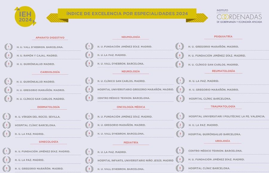 De acuerdo con este índice, el Hospital Universitario Fundación Jiménez Díaz encabeza tres especialidades (Ginecología, Neumología y Oncología Médica), mientras que el Hospital Universitario La Paz lidera dos áreas (Pediatría y Reumatología). El IEH 2024 analiza anualmente la excelencia de los centros hospitalarios españoles, tanto públicos como privados, a través de tres ejes: el general, el autonómico y el de especialidades, que revela los tres principales centros en doce disciplinas médicas.