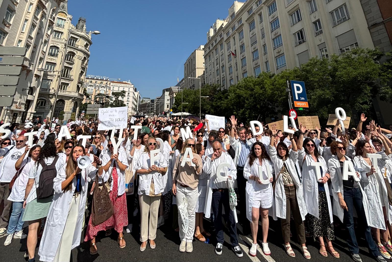 Este viernes, médicos de toda España han secundado una huelga histórica, por abarcar el conjunto de España, contra la reforma del Estatuto Marco emprendida por Mónica García. La convocatoria, de la Confederación Española de Sindicatos Médicos (CESM) y el Sindicato Médico Andaluz (SMA), reclama entre otras cosas que los facultativos tengan una jornada de 35 horas semanales así como que la jornada ordinaria y la guardia tengan una duración y franja horaria "claramente delimitadas". Entre las reivindicaciones, además, está la de que sea un estatuto específico sobre la profesión médica. El borrador, que llegó a plantear la exclusividad en la pública durante cinco años para los MIR, sí mantiene otro punto polémico: que mandos intermedios y personal directivo de la pública no pueda también trabajar en la sanidad privada.