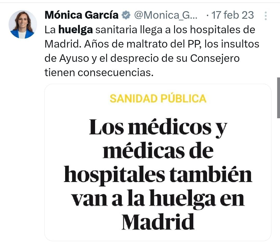 El contraste desde que es ministra es demoledor. Durante los días previos al inicio de la huelga médica de 2025, su perfil en redes sociales se ha llenado de mensajes sobre asuntos políticos -principalmente críticas a Ayuso, comentarios sobre presupuestos, déficit o ataques al PP, Vox y Junts- además de publicaciones institucionales como el Día Mundial del Sida. Sin embargo, ‘casualmente’ no aparece ni una sola referencia a la huelga médica, pese a tratarse del conflicto laboral sanitario más relevante de los últimos años.