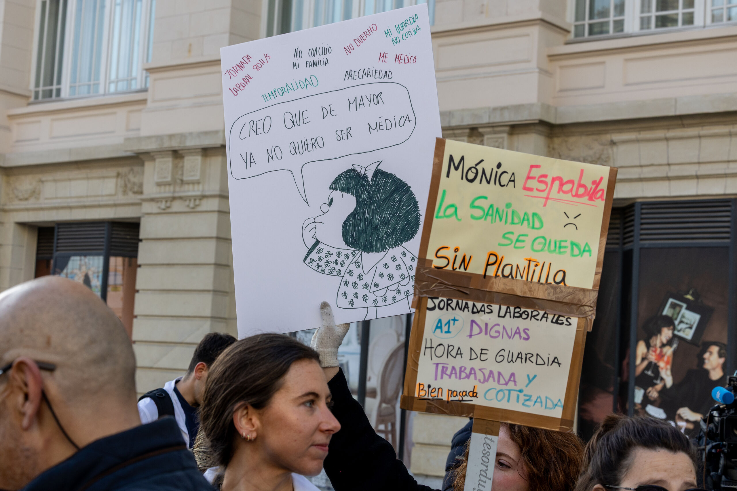 Durante las protestas, los facultativos han coreado consignas dirigidas a la ministra Mónica García, a la que tildaron de "traidora" por no aprobar un estatuto propio para los médicos.