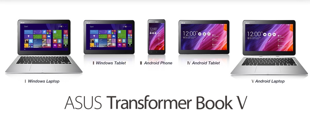Como ordenador portátil, el Transformer Book V ofrece la posibilidad de ejecutar Windows 8.1 o Android 4.4. Los sistemas operativos son conmutables casi instantáneamente a través de un botón. Incluye además un teclado QWERTY completo. El portátil tiene una pantalla táctil extraíble HD IPS de 12.5 pulgadas que se convierte en un tablet independiente. Tiene un procesador Intel Core y viene con 1 TB de almacenamiento.