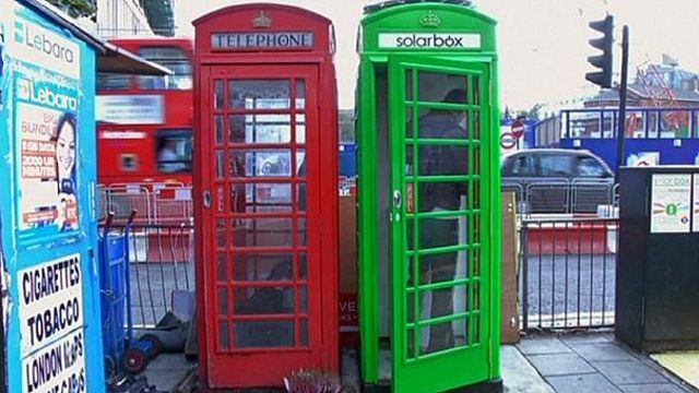 Gracias a la luz del sol estas cabinas permiten a los londinenses recargar sus teléfonos móviles de manera gratuita mientras ven algunos anuncios de publicidad. Se trata de un proyecto de dos licenciados de la London School of Economics. Las cabinas, controladas por un servicio técnico a diario, permanecen cerradas durante la noche.