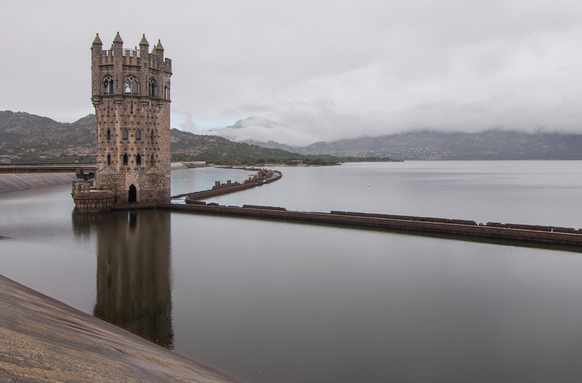 Aquí empieza todo, en los embalses que el Canal de Isabel II tiene en la sierra de Madrid. Son 14 de distintos tamaños y de distintas épocas y algunos incluso de dos épocas, como este Embalse de Santillana que hemos visitado y que fue construido por el Marqués de Santillana a principios del siglo XX y luego ampliado en los años sesenta. La vieja presa, que en la imagen vemos casi completamente sumergida, tenía elementos peculiares como la torre, cuyo fin es meramente decorativo.