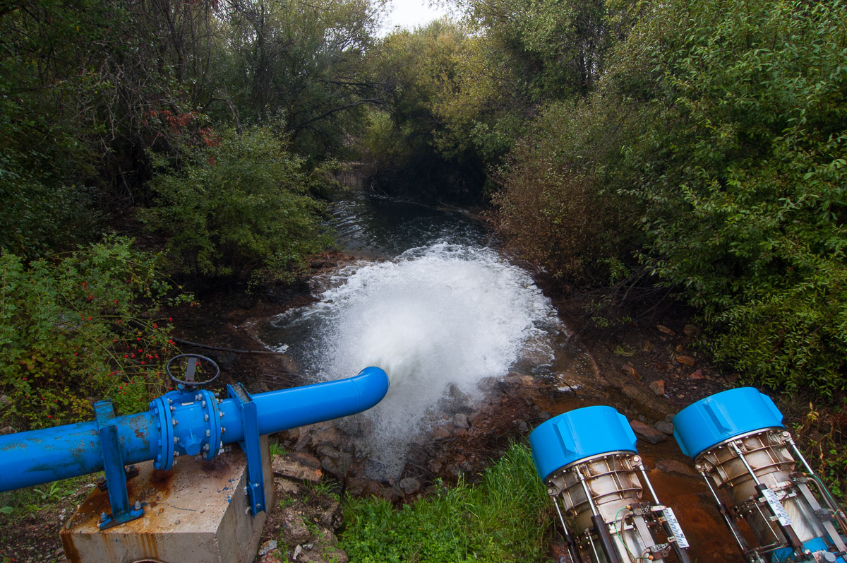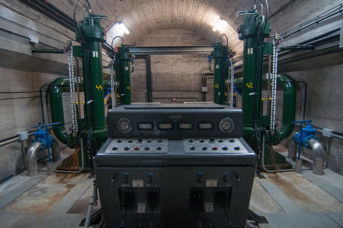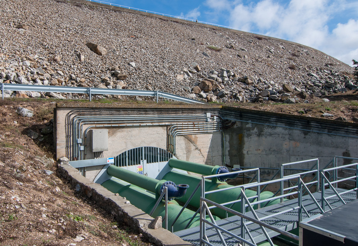 Este es el punto en el que agua abandona el embalse a través de las tuberías que vemos en el interior. De ahí pasa a dos pequeñas estaciones: una en la que se reduce la enorme presión a la que el agua sale de la presa y una segunda en el que se le hace un primer pretatamiento. De allí parte a la planta potabilizadora.