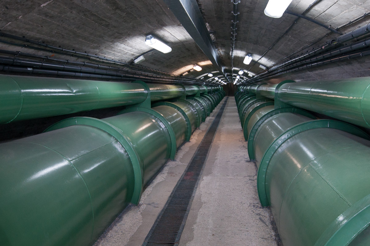 En el interior de la presa esta sala, quizá la mayor de la gran estructura, es desde la que se abre o se cierra el suministro a las dos grandes tuberías que llevarán el agua a la estación depuradora y de allí a Madrid. Cada tubería tiene dos válvulas -los cuatro cilindros verdes que vemos al fondo-: una de seguridad y otra la que se opera habitualmente.