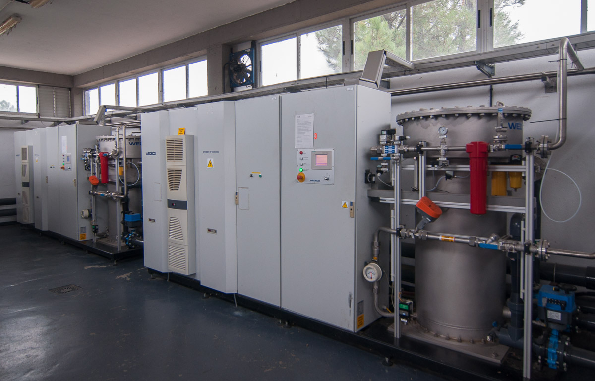 Cuando el agua llega a la estación de tratamiento de aguas y potabilización el primer tratamiento que recibe es un proceso de oxidación que elimina buena parte de los microorganismos que pudiese tener el agua. Se hace con un proceso de alta tecnología en el que se introducen en el agua cloro y ozono. El líquido elemento se guarda en depósitos muy profundos y el ozono se inyecta por debajo para que, en su recorrido hacia la superficie, tenga el mayor contacto posible con los elementos a eliminar. Para esto se utiliza tecnología de última generación como las máquinas que vemos en la imagen.