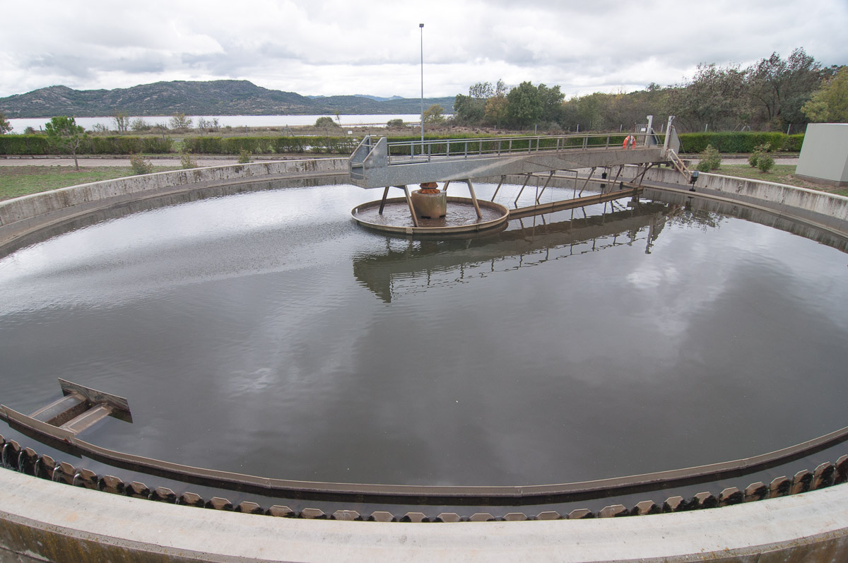 En estos tanques circulares de decantación el agua sigue limpiándose de impurezas, para ello se vierte por el centro y se utiliza la acción de un gran 'pala' -el brazo blanco que vemos en la imagen- que va moviendo ligeramente el agua. La forma del fondo, más profundo en el centro que en los bordes, favorece también el proceso.