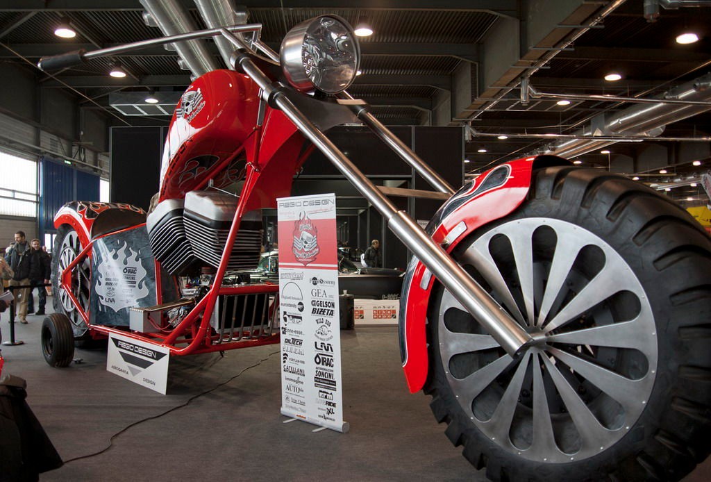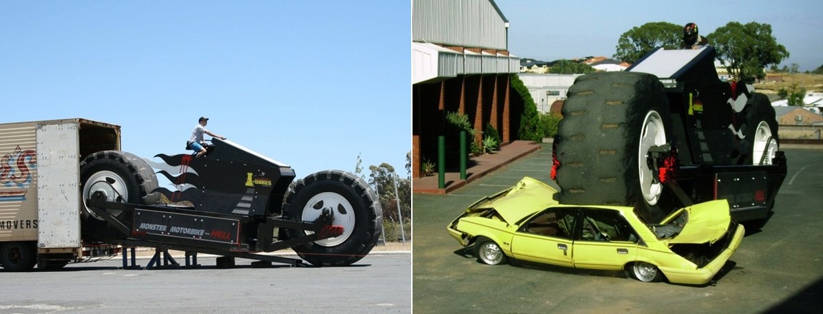 La motocicleta más grande del mundo de 1998 fue creada por el acróbata australiano y fanático de las motos Ray Baumann. Tardó tres años en construirla, y no es mucho para esta obra de ingeniería. La Monster Motorbike From Hell es capaz de destrozar y aplastar cualquier coche con sus enormes dimensiones: 9 metros de longitud, tres metros de altura, trece toneladas… Su motor 14.0 (por ahí se va como el Veyron) de camión de 6 cilindros Detroit Diesel de 400 CV ayuda también a elogiarlo. Pero sin duda, lo más impresionante son las gigantescas ruedas: el motor transmite su fuerza a la rueda trasera mediante una cadena de 25 centímetros de grosor; estas ruedas miden tres metros de diámetro y uno de ancho, sacadas de un camión Caterpillar de toda la vida.