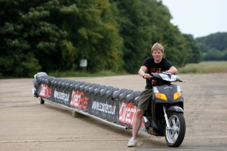 El plomero Colin Furze creó una motocicleta del largo de un campo de tenis, la más larga del mundo y que se incluyó en el libro de Récord Guinness. El increíble móvil tiene 22 metros de largo, un estanque de scooter de 125 cc. y puede transportar a 25 personas. Su creador tiene 31 años y se dedica a la plomería, pasó un mes en el garage de su madre mientras se enfrascaba en la construcción de la motocicleta, con el propósito de batir el anhelado récord.