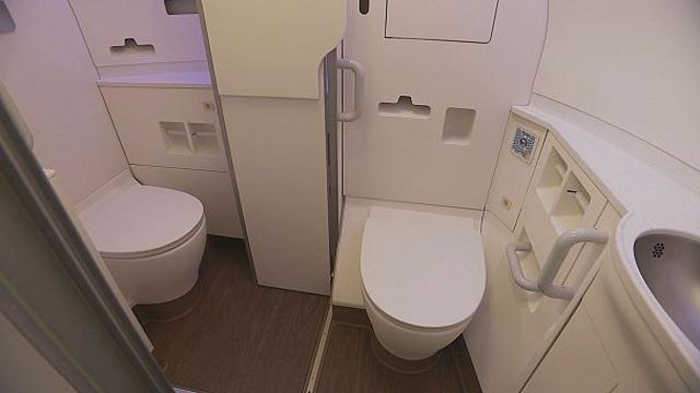 “Estos dos lavabos están separados por un tabique que puede desaparecer. Cuando abrimos las dos puertas lo que conseguimos es un espaciomucho más amplio. Un espacio que permite a los pasajeros con movilidad reducida tener más autonomía, más espacio, como ya he dicho, y más intimidad”, explica Marc Muller, de Airbus.