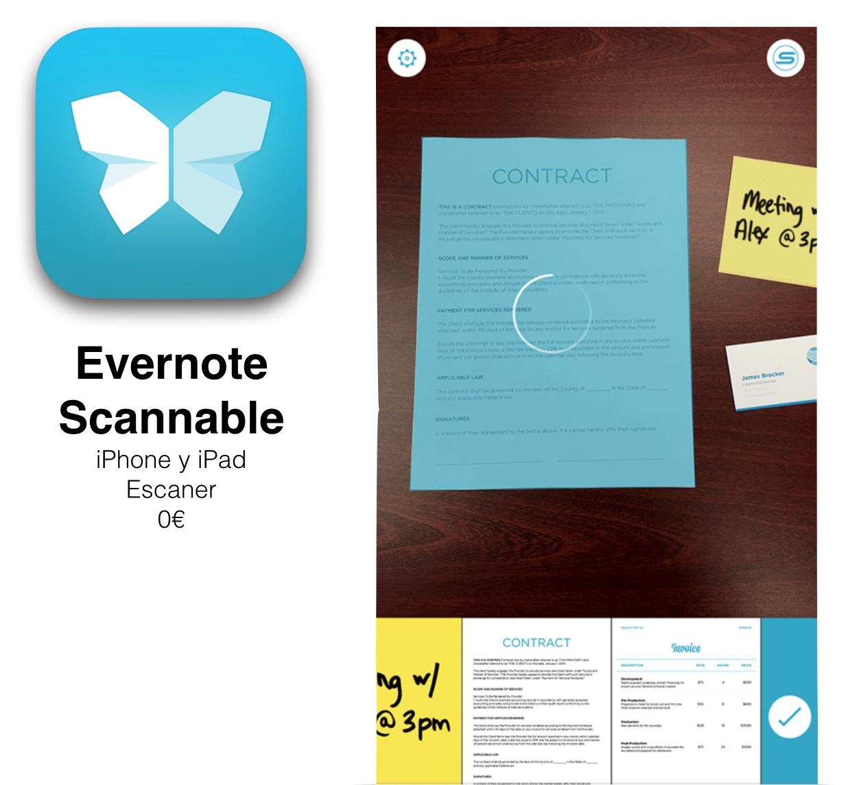 Evernote Scannable. Es la mejor forma de escanear documentos desde el iPhone. No tienes que hacer más que encuadrar la imagen. Reconocerá los bordes, elegirá el mejor formato y reconocerá el tipo de documento. Sólo te quedará elegir donde quieres guardarlo o enviarlo.