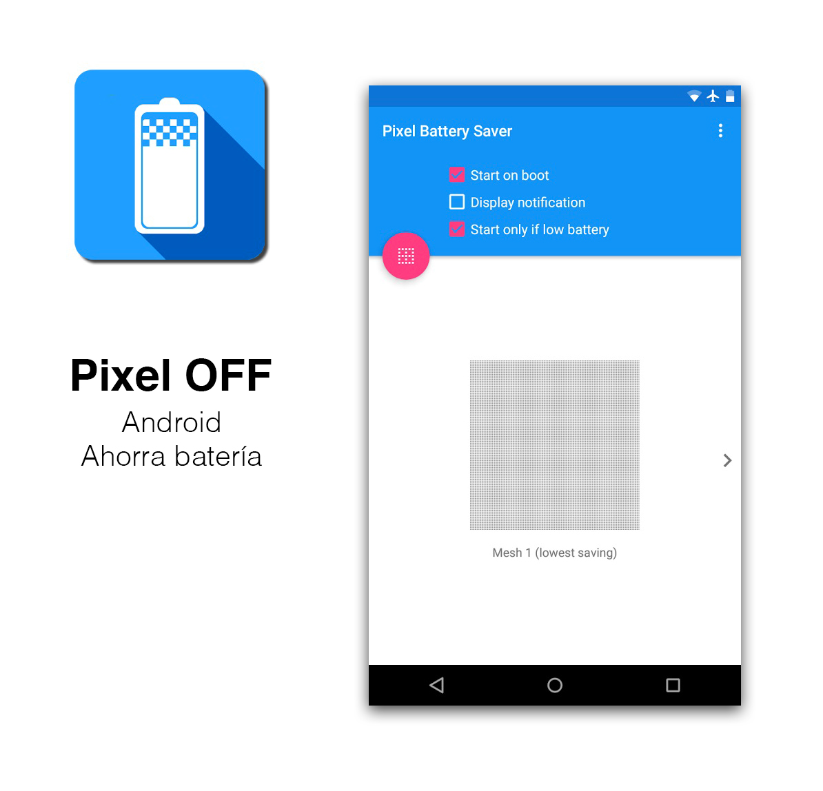Pixel OFF. Si esperas tener un día de uso prolongado del móvil, esta app permite apagar algunos píxeles con el objetivo de ahorrar batería mostrando unos puntos negros muy pequeños y que son prácticamente insignificantes para la vista del usuario.