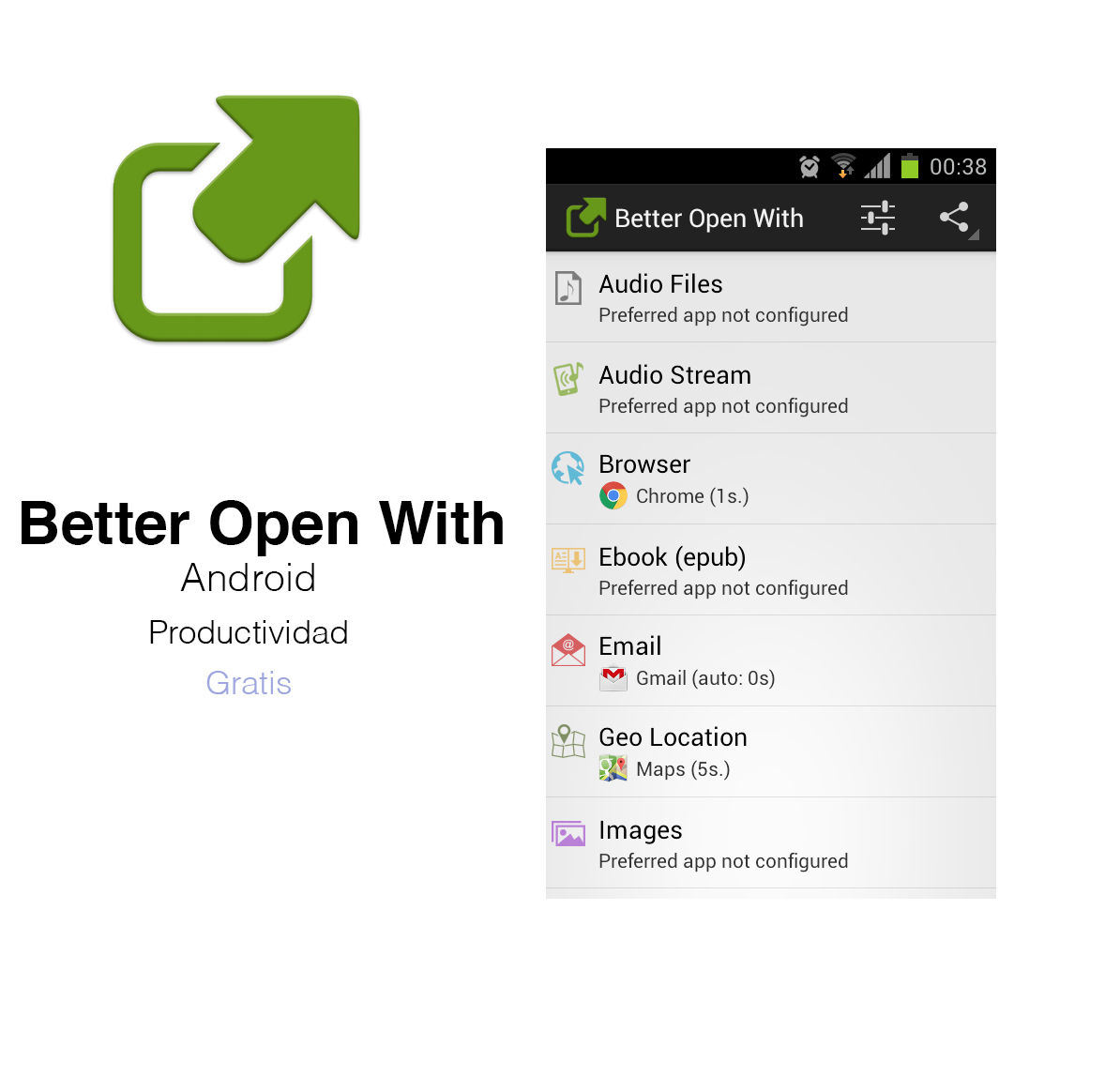 Better Open With. Con esta aplicación cuando Android nos pida una aplicación para abrir cualquier cosa, le damos la prioridad a Better Open With. Dentro de la aplicación seleccionamos nuestras aplicaciones preferidas para cada tarea que nos pueda salir.