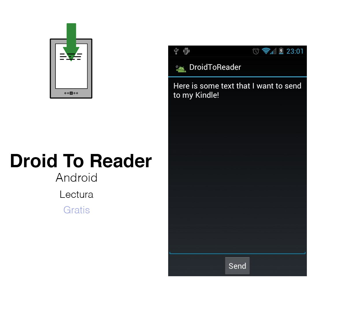 Droid To Reader. Con esta app puede enviar cualquier página web a tu Kindle de forma inmediata y poder leerlo allí cuando quieras. Envía también artículos largos y leelos más tarde con la comodidad de tu ebook y sin que te dañe la vista ni se te canse.