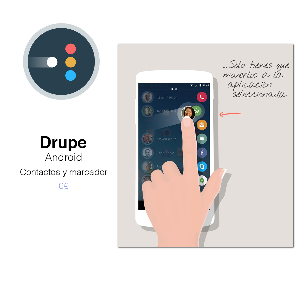 Drupe. Reune tus aplicaciones de contactos y comunicaciones en un mismo lugar accesible desde todas tus pantallas. ¿Quieres contactar con un amigo? ¿Lllamar o sólo enviar un mensaje de texto a alguien? ¡Sólo tienes que arrastrar el contacto a la aplicación que elijas para ponerte en contacto!