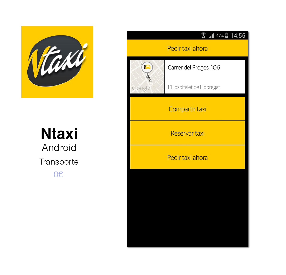 Ntaxi. Con esta app podrás solicitar y reservar taxis de forma instantánea a través de tu smartphone. Además, si quieres que tu trayecto sea más económico, podrás compartir taxi con otros usuarios. Además, podrás disponer de información sobre el coste estimado del servicio. De momento sólo está disponible en Barcelona.
