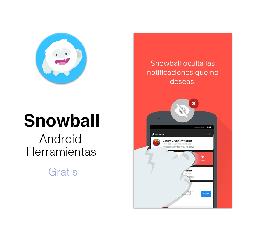 Snowball. Las notificaciones son excelentes, hasta que recibes demasiadas. Snowball se asegura de que recibas las notificaciones que deseas y ninguna más. Se deshace automáticamente de las notificaciones que no deseas y sin pasar por alto las notificaciones importantes. Simplemente desliza una notificación para ocultarla o da prioridad a futuras notificaciones de esa aplicación. Además, aprenderá a hacer predicciones y sugerencias con el paso del tiempo.