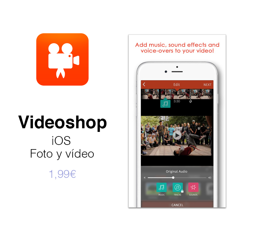 Videoshop. Una App sencilla para editar vídeos y audios para montar tus películas con efectos especiales. Su precio es asequible, 1,99 €.