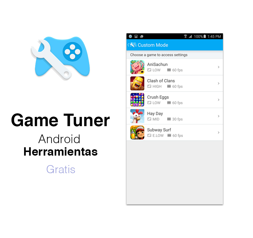Game Tuner. La aplicación nos mostrará una lista de los juegos que tenemos instalados en nuestro terminal, y nos dará la opción de entrar en cada uno de ellos para configurarlos individualmente. Podremos elegir varias configuraciones predeterminadas, pero también podremos personalizarlas, modificando el ratio de resolución y la tasa de frames por segundo.