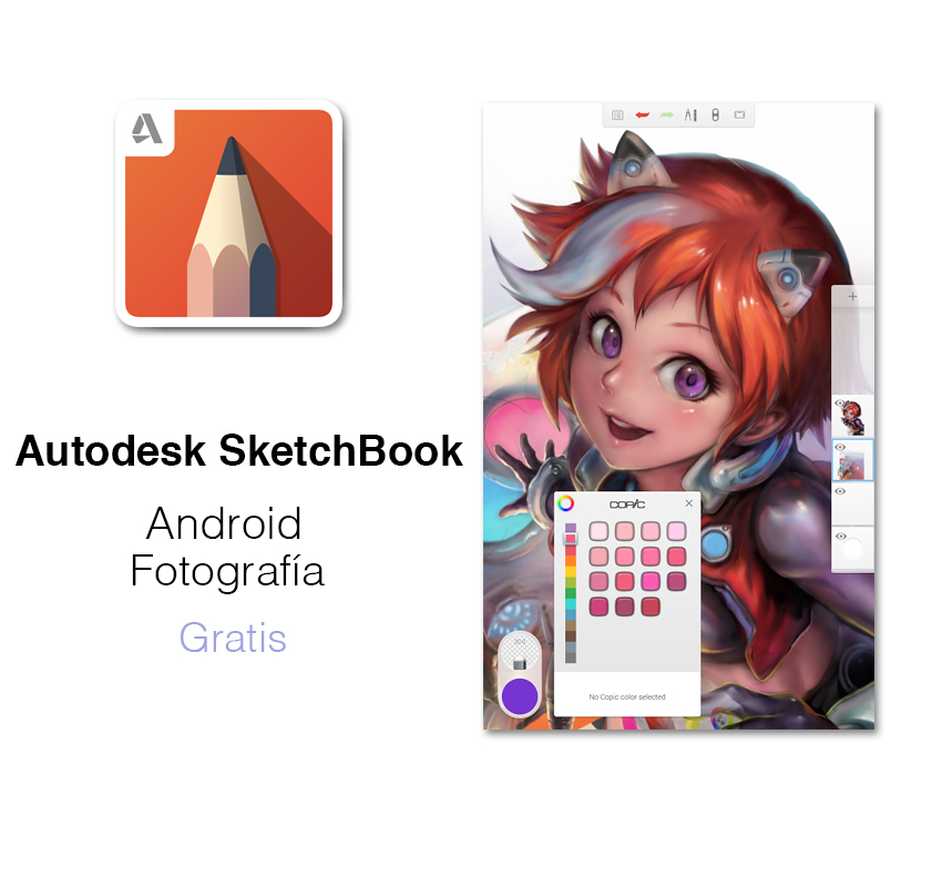"Autodesk SketchBook". Una intuitiva aplicación de dibujo y pintura diseñada para los usuarios de todos los niveles de habilidad a los que les guste dibujar. Han rediseñado el motor de pintura, de modo que SketchBook ofrece unos lápices más fluidos y una pintura más natural que nunca, pero manteniendo la misma interfaz bien organizada y sencilla.
