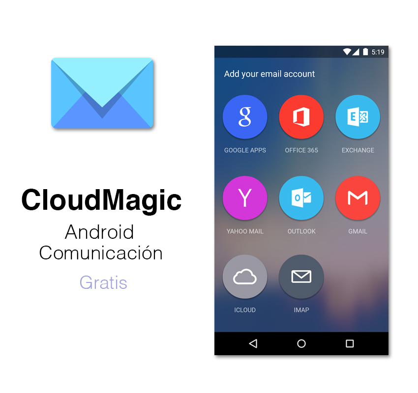 "CloudMagic". Un cliente que acepta cuentas de Gmail, Hotmail, Yahoo Mail, Outlook.com, iCloud, Google Apps, Microsoft Exchange, Office 365, Mail.com, GMX, AOL y otras cuentas IMAP. Perfecto para aquellos que dispongan de varias y deseen gestionarlas desde un mismo lugar, ya que es compatible con hasta 5 al mismo tiempo.