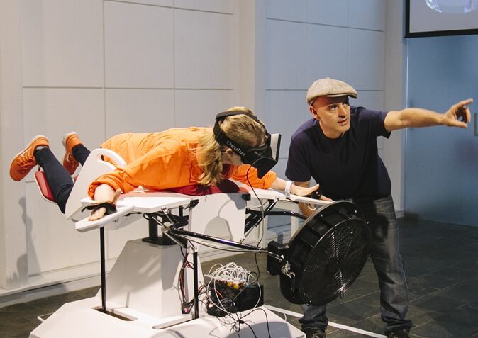 Para hacer realidad este sueño, el artista e inventor Max Rheiner, junto a la empresa Somniacs, propone que te coloques boca abajo sobre una plataforma con módulos articulados y móviles y unos cascos de realidad virtual como los Oculus Rift o los HTC Vive.