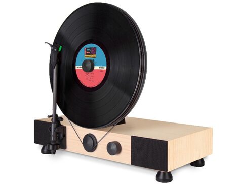 Consiste en un tocadiscos en el que los vinilos se colocan verticalmente y los puedes ver girar mientras disfrutas de la música. Precisamente lo que vende Gramovox es un estilo retro que casa muy bien con la forma de escuchar los vinilos.