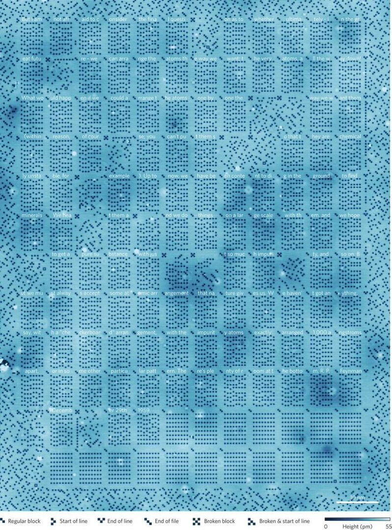 Con esas consideraciones en mente, los expertos lograron mantener la posición de más de 8.000 "vacantes de cloro" (átomos extraviados) durante más de 40 horas a una temperatura de 77 kelvin. Tras crear un alfabeto binario a partir de las "posiciones vacantes", fueron capaces después de almacenar diferentes textos, entre ellos el mencionado de Feynman, sobre la superficie,que pudieron modificar a su antojo bit a bit.
