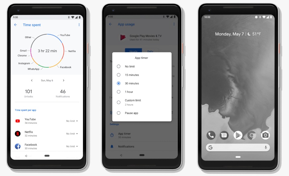 Entre otras novedades, también han introducido una característica configurable que degrada los colores hasta dejar la pantalla en gris para indicar que es tarde, y que no deberíamos eternizarnos usando el móvil en la cama sino irnos a dormir ya. También cuanta con una aplicación que monitoriza el tiempo que el usuario pasa en el móvil y una opción para programar tiempos límites en aplicaciones.