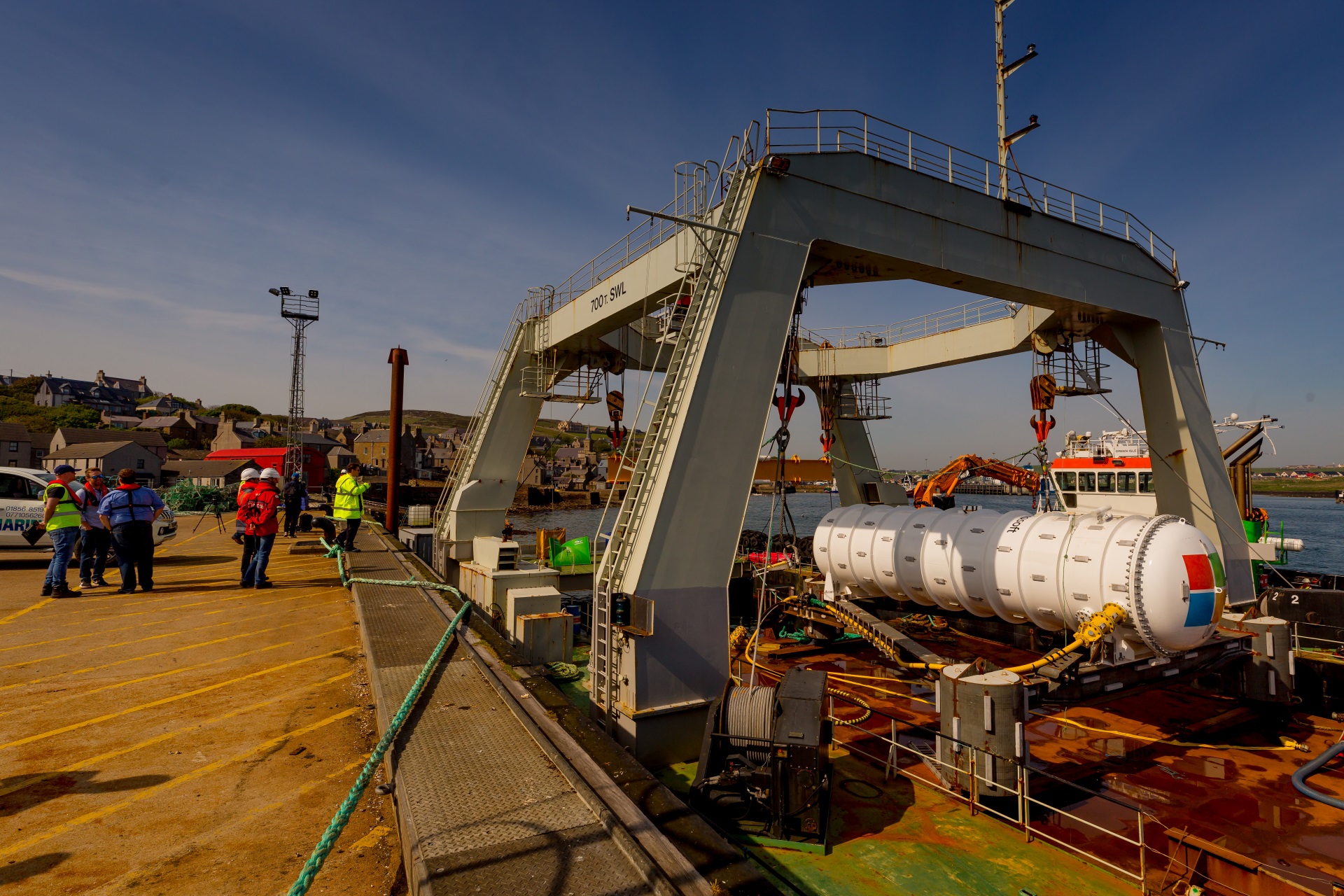 El centro de datos es cargado en una grúa pórtico en preparación para su despliegue en el fondo marino cerca de las islas Orcadas en Escocia.