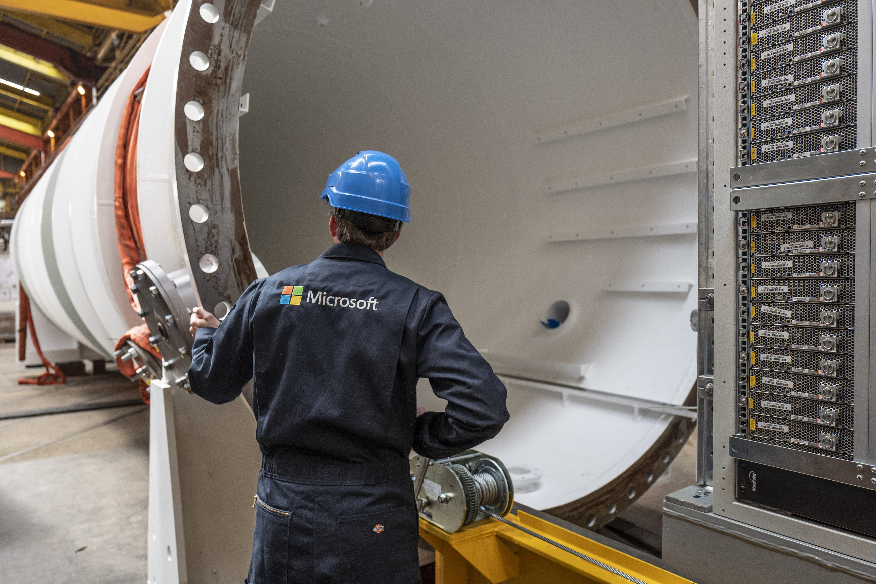 Spencer Fowers inspecciona el tubo submarino del tamaño de un contenedor al que están a punto de cargar con los servidores.