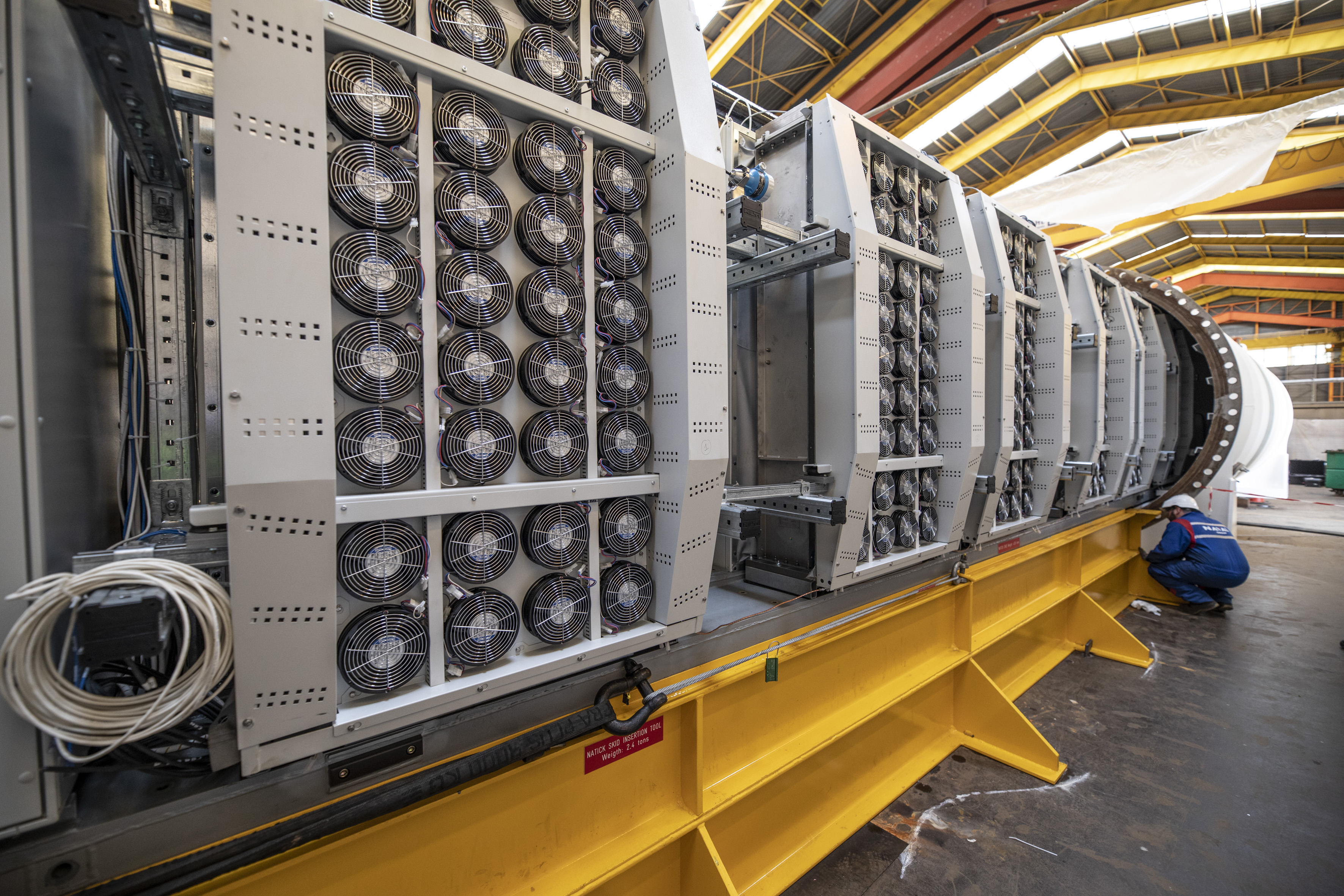 Los 12 armarios de servidores a punto de ser cargados en el contenedor submarino en las instalaciones de Naval Group, en Brest (Francia).