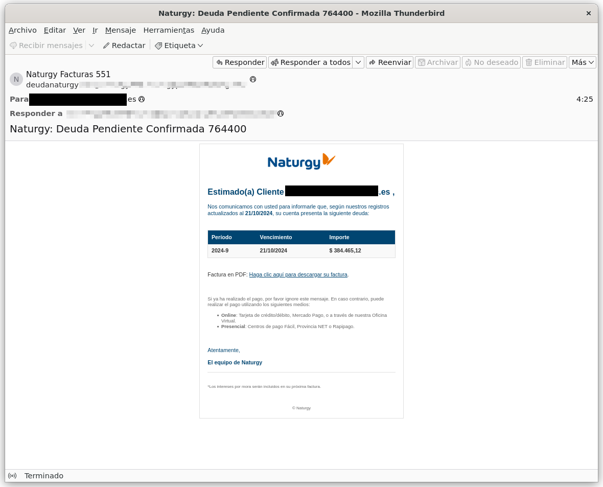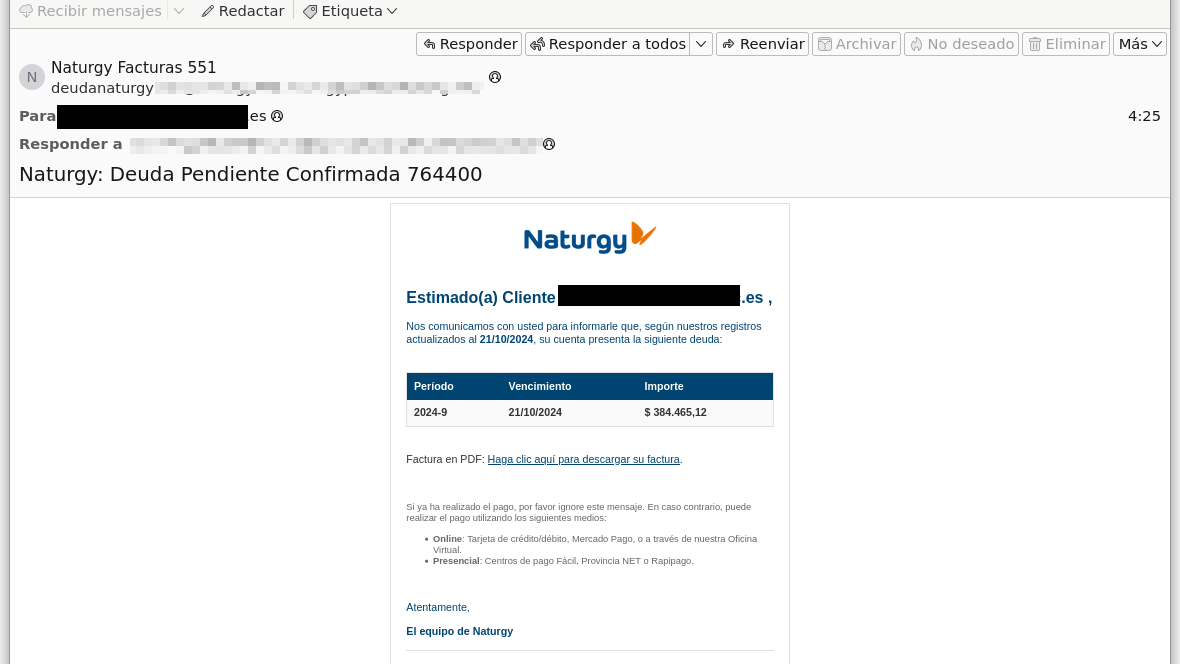 La Guardia Civil ha avisado de que se ha identificado una serie de correos electrónicos fraudulentos que suplantan la identidad de empresas energéticas reconocidas como son Endesa, Iberdrola y Naturgy. Estos correos tienen como objetivo engañar a los usuarios para que descarguen un archivo comprimido (.zip) que supuestamente contiene una factura pendiente de pago. Sin embargo, dicho archivo oculta un ejecutable malicioso diseñado para instalar el malware Grandoreiro en el dispositivo del usuario.