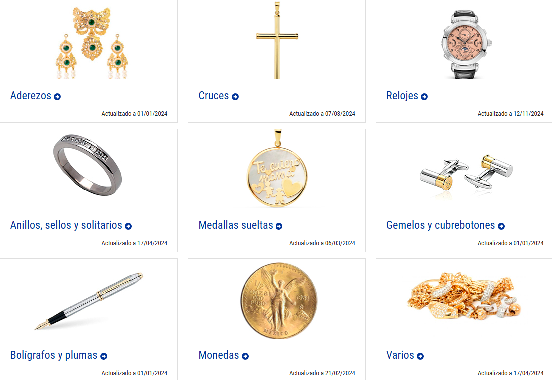 Al pulsar sobre cada una de estas categorías, se despliega un menú en el que podemos visualizar todos los objetos que quedan por devolver a sus dueños. Al seleccionar la joya, se amplía la imagen y aparece una descripción de la misma junto con los datos de la unidad policial que la recuperó.
