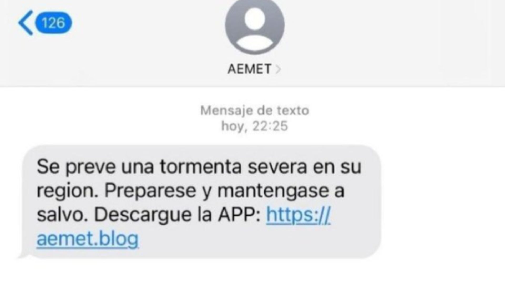 "Se prevé una tormenta fuerte en su región. Prepárese y manténgase a salvo. Descargue la APP". Así es el mensaje de texto que han estado recibiendo algunas personas en las últimas horas con motivo del temporal de lluvia que está arrasando toda España, sobre todo en la zona este y sur peninsular, y en el que se están haciendo pasar por la Agencia Estatal de Meteorología (AEMET).