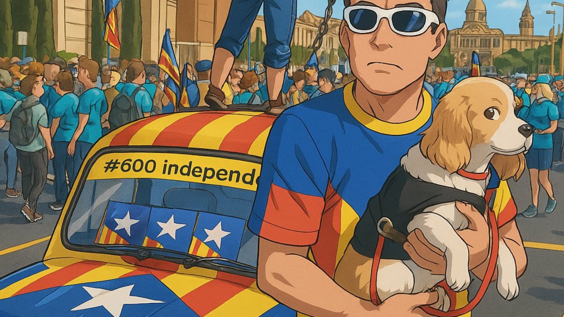 Esta foto estilo anime recrea una imagen en la que sale un independentista con su perro.