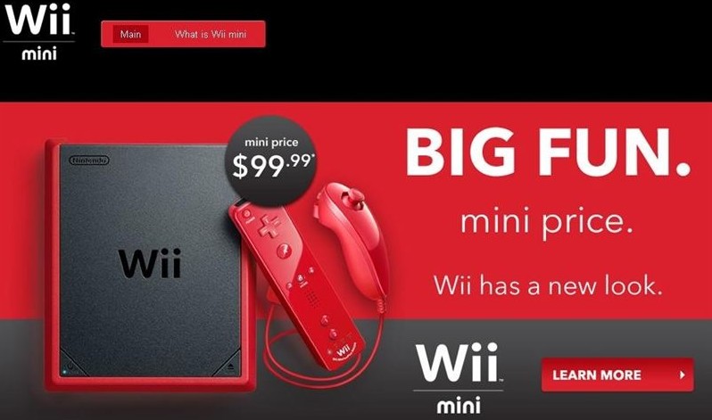 Después de dichas especulaciones, la rumoreada Wii Mini se ha confirmado a través de Nintendo Canadá. En una nota de prensa la división canadiense de Nintendo ha anunciado que Wii Mini es una realidad y que llegará el próximo 7 de diciembre, de momento a Canadá. La consola es una versión más pequeña de la Wii tradicional, con un diseño en el que el negro y el rojo son los colores predominantes.