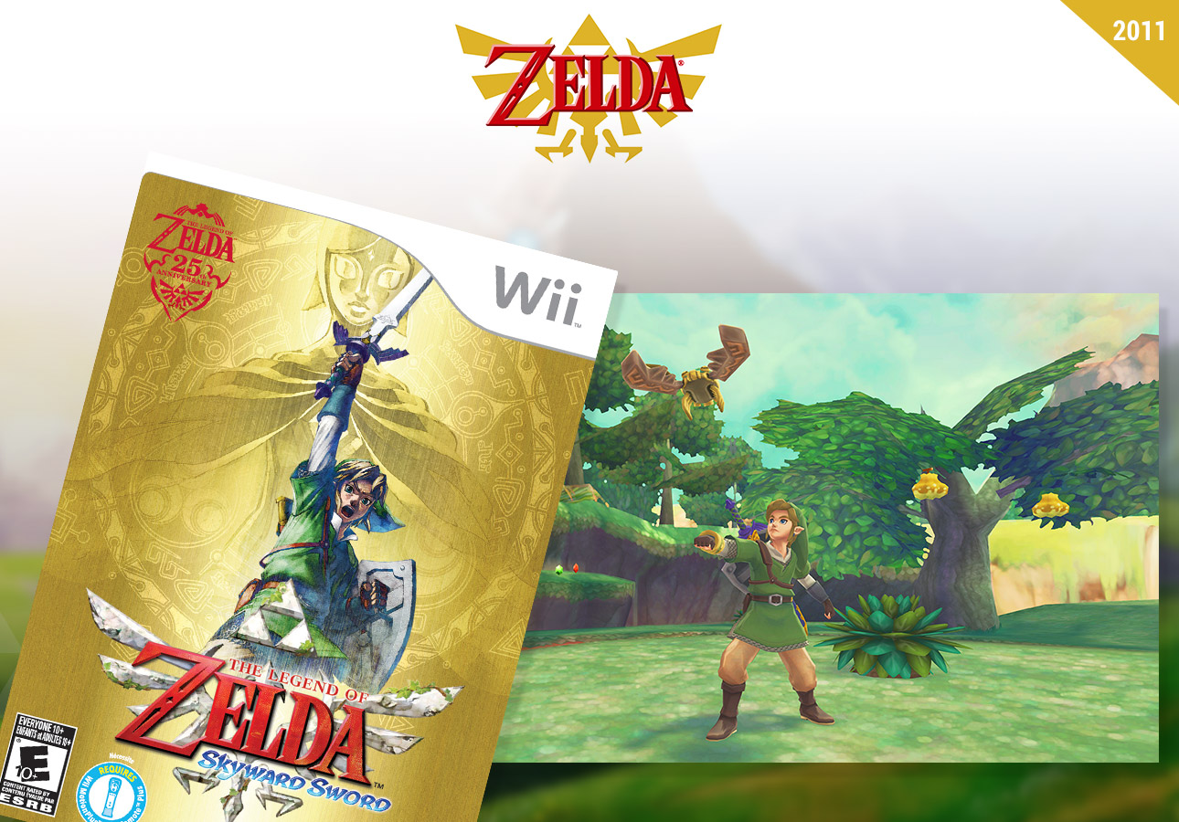 Primer título de la saga desarrollado en exclusiva para Wii, y explotando al máximo por lo tanto las capacidades del célebre mando Wiimote. Concebido como una precuela de Ocarina of Time, Skyward Sword destacó por ciertas innovaciones en las mecánicas clásicas de la saga y por su espectacular trabajo artístico.