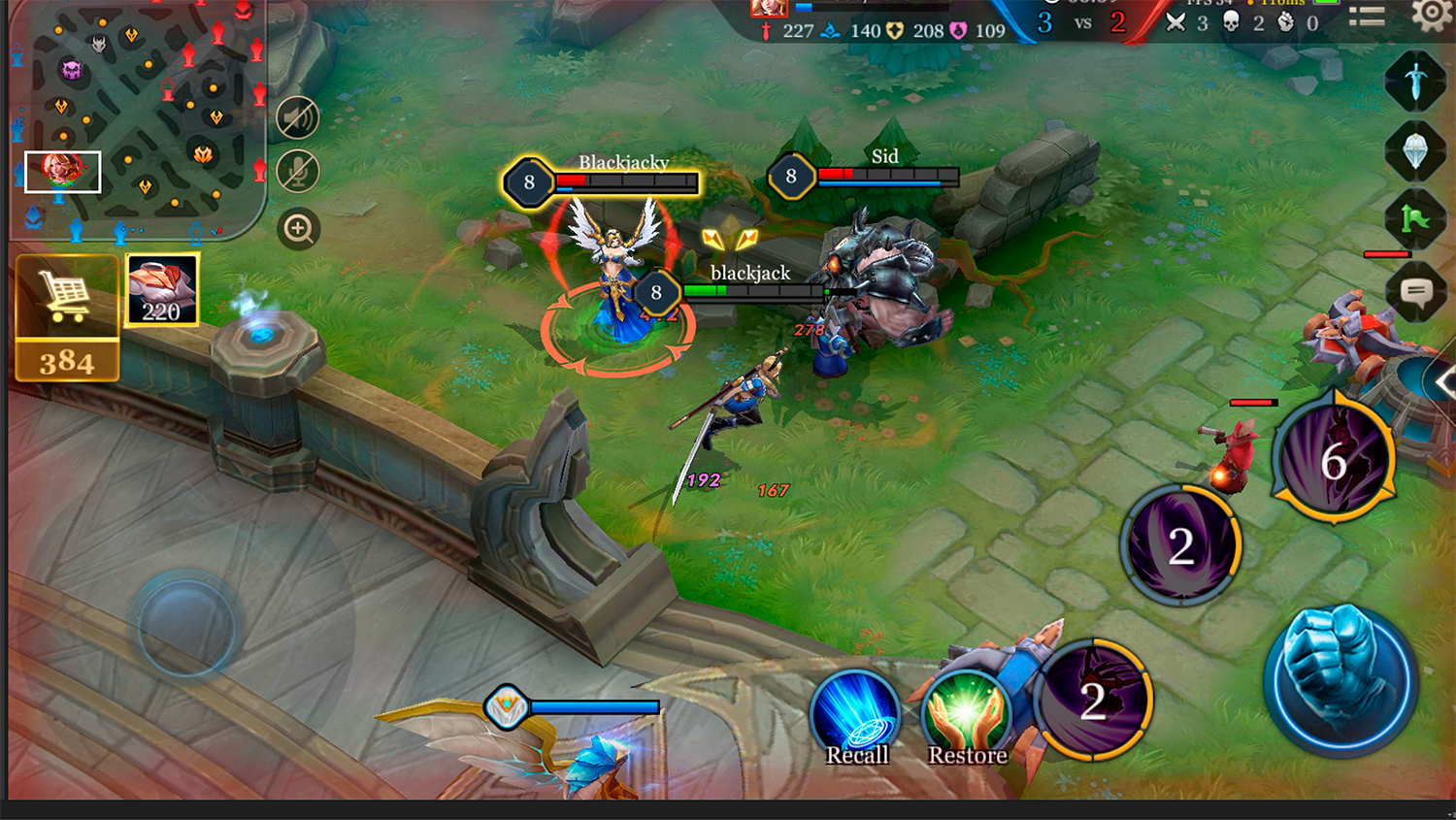 Hay dos partes a tener en cuenta: la función de cada personaje y la del equipo. En cuanto al personaje, conviene tener clara la función de cada mano: con la izquierda nos movemos y compramos, con la derecha atacamos y mejoramos los ataques. Así de sencillo: el joystick virtual se sitúa bajo el pulgar izquierdo, y bajo el derecho se despliegan las opciones para agredir al rival. Cada uno de estos ataques tiene un tiempo de recuperación (en función del nivel) y pueden ir mejorando con un simple toque en el momento correspondiente. La tienda, por su parte, está disponible durante toda la partida, si bien para facilitarnos las cosas nos ofrece en primer lugar los objetos que ya podemos adquirir, haciendo así que todo sea más sencillo y rápido para los usuarios, que probablemente ya se encuentren en plena batalla.