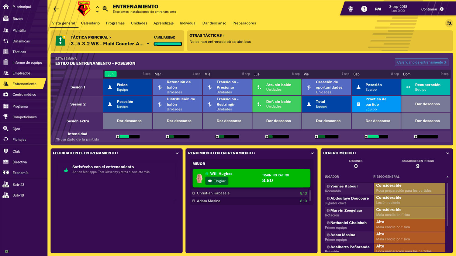 Gracias a que se han rediseñado los apartados dedicados a los entrenamientos y la táctica, las iniciaciones multiplican el potencial de los jugadores. Al comenzar una partida nueva es posible indicar tu experiencia en la serie, lo que determinará si participas en la iniciación al principio de tu carrera. Como es costumbre, Football Manager 2019 presenta una serie enorme de campeonatos y categorías. Puedes, literalmente, entrenar a cualquier equipo del mundo y aquí está la primera novedad del nuevo año: Sports Interactive ha llegado a un acuerdo con la Bundesliga alemana y, finalmente, las formaciones germanas ya no tendrán que conformarse con nombres ficticios ni escudos inventados. Nosotros, como no podía ser de otra manera, hemos seleccionado el modesto Marbella del Grupo 4 de la Segunda División B, para comenzar nuestro periplo como entrenadores desde un equipo discreto.