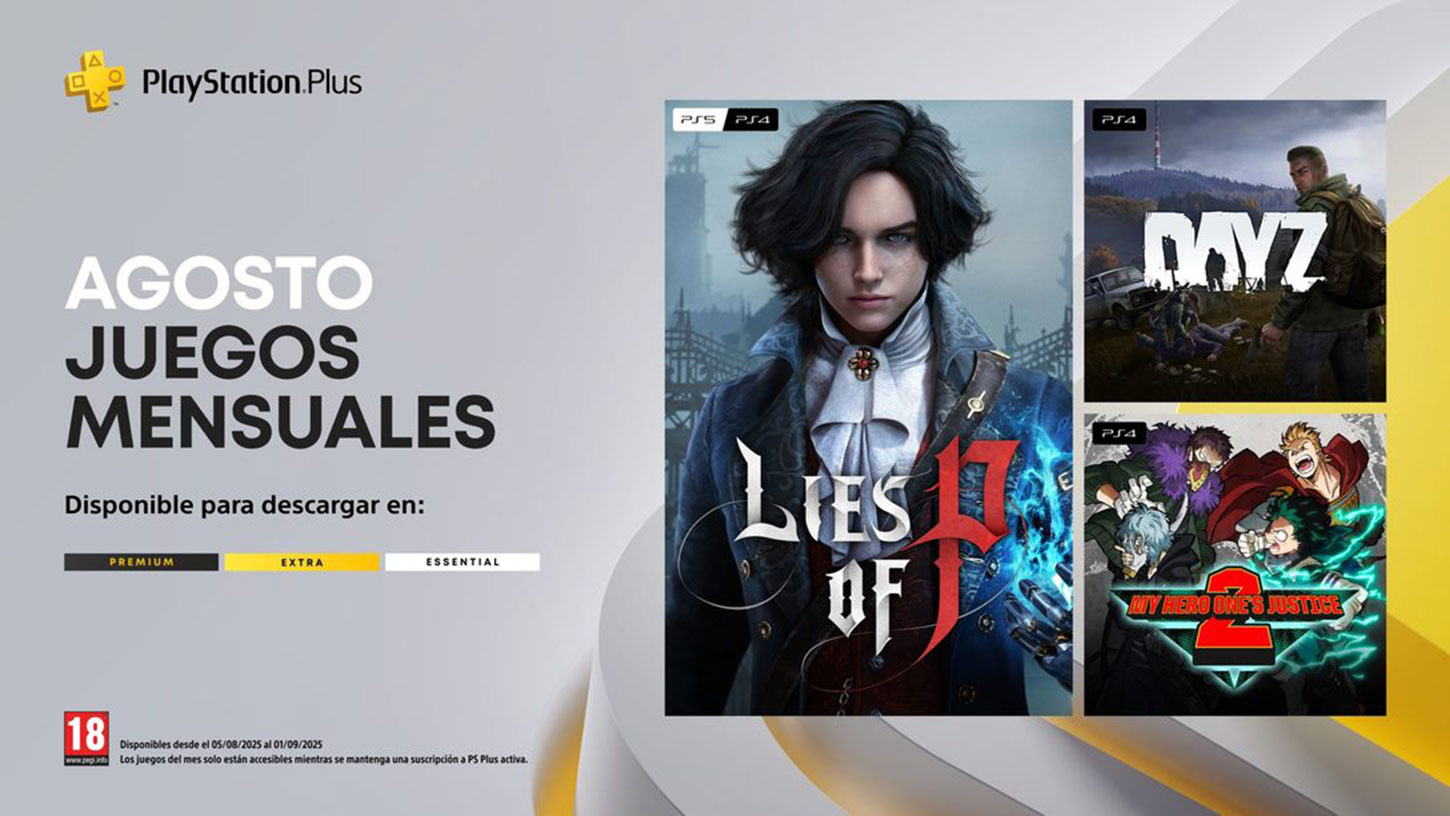 Los altos mandos de la división de juegos de Sony han confirmado el listado de juegos que los suscriptores de PS Plus, en cualquiera de sus modalidades, podrán reclamar en agosto de 2025. Se trata de ‘Lies of P’ (PS4/PS5), ‘DayZ’ (PS4) y ‘My Hero One's Justice 2’ (PS4). Todos se podrán canjear en la cuenta del usuario a partir del 5 de agosto, con fecha límite fijada en el 2 de septiembre. A continuación, puedes consultar un resumen de los juegos con su correspondiente vídeo y la indicación de las plataformas de destino: