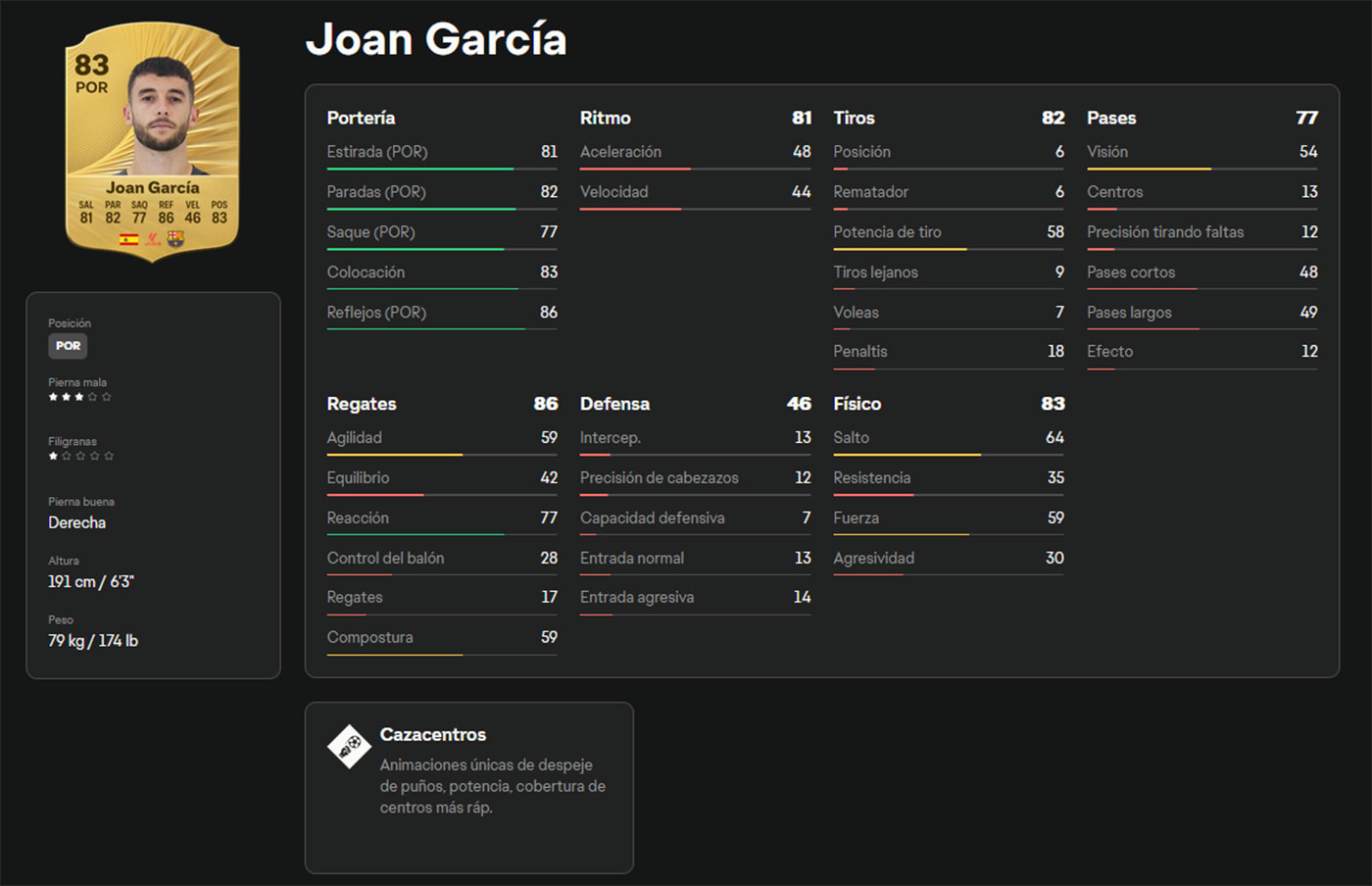 Si estás empezando un equipo de LaLiga o buscas invertir en un equipo, Joan García podría ser una gran opción. Juega en el Barcelona, algo que facilita enormemente su química con otros jugadores de nuestro campeonato y nacionalidad. Además, tiene un perfil de portero líbero, lo que le ayuda a salir rápidamente del arco cuando el rival intenta dar profundidad con un balón largo. Con 1,91 m de altura, cubre bien el área y ofrece seguridad en centros y balones aéreos.